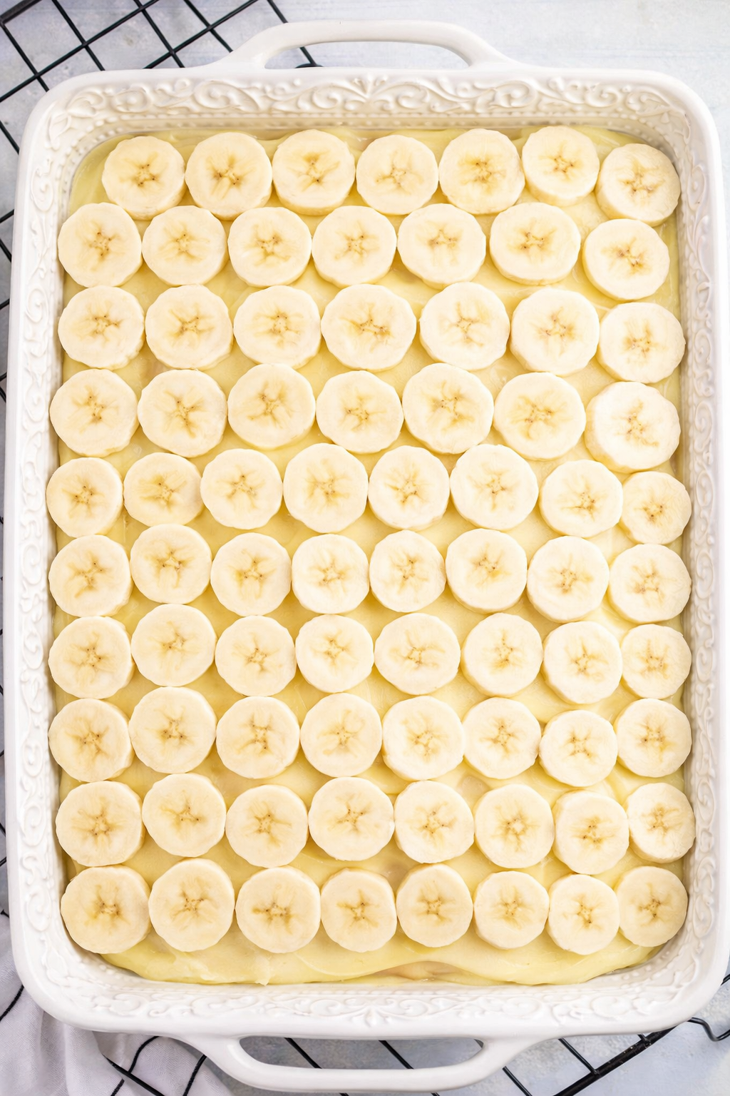 - Spread the pudding mixture over top of the cake, then top with a layer of banana slices, reserving a few for the top