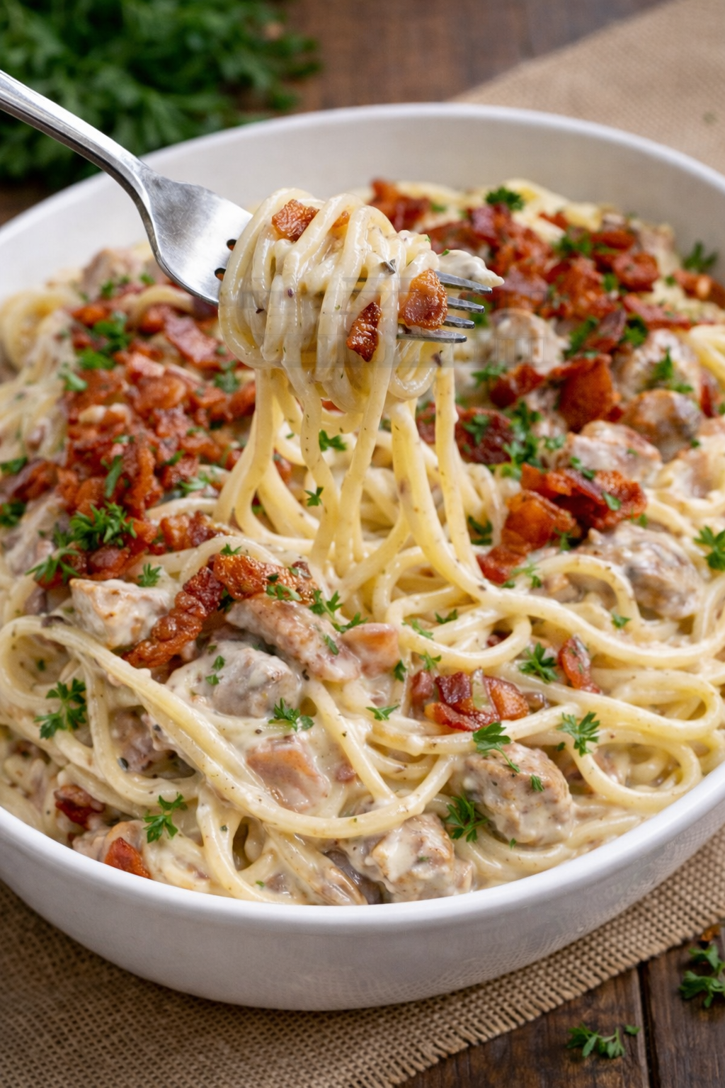 Traditional Italian carbonara does not use cream or chicken. This is a creamy, American-style twist that combines classic carbonara elements with added protein and richness.