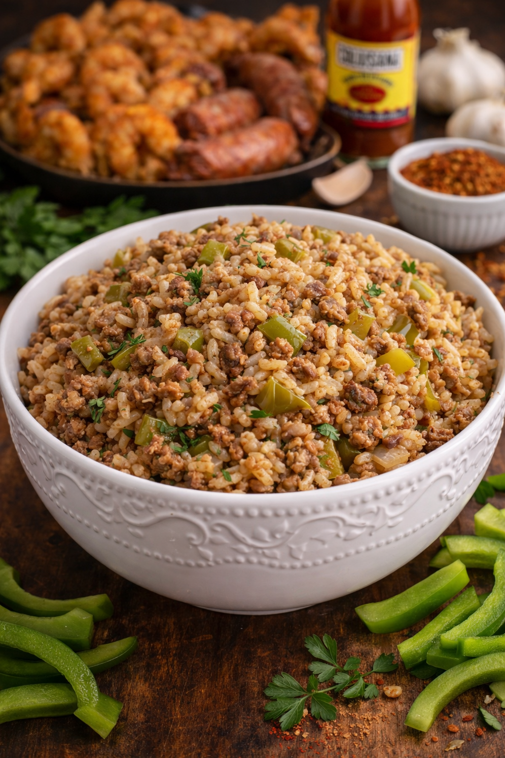 The combination of the different meats creates a rich and meaty base, while the onions and peppers add a pop of freshness and crunch. The Cajun seasoning ties everything together with its signature blend of herbs and spices, adding a delicious kick to every bite.