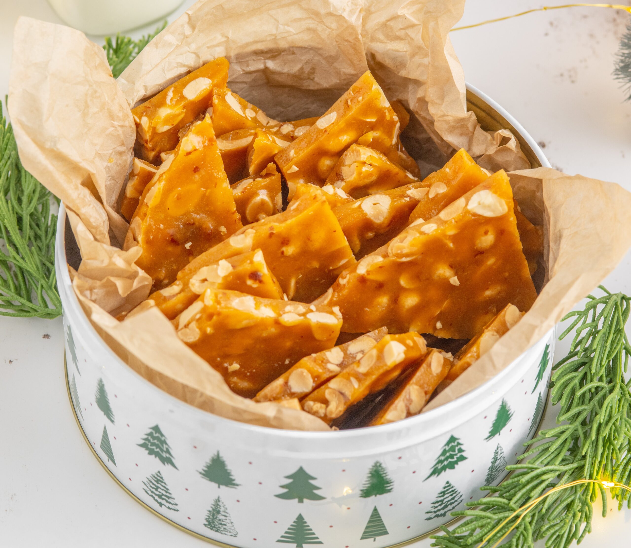 Peanut brittle is one of the best homemade edible gifts because it stays crisp, stores beautifully, and looks gorgeous in holiday tins. Once the brittle has cooled and been broken into pieces, layer it into cookie tins lined with parchment or festive tissue paper. Mix large shards and small pieces for a pretty presentation. Because this brittle doesnโt melt or smear, it ships well and stays crunchy even after several days.