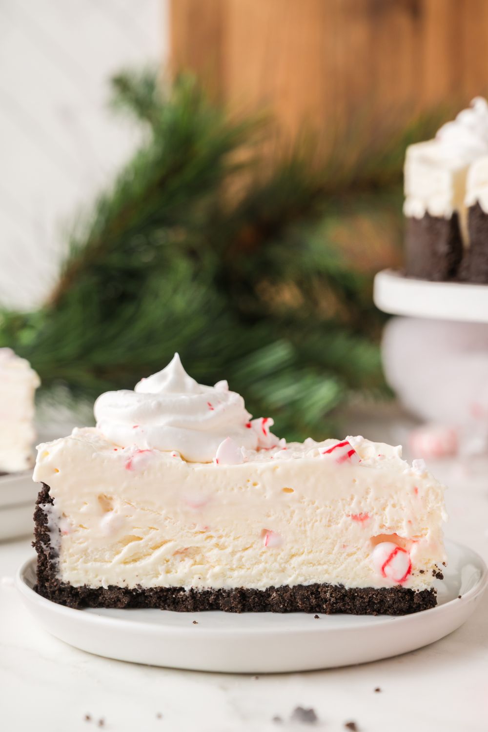 - When ready to serve, thaw slightly, top with whipped cream and more crushed candy canes, slice, serve, and enjoy!