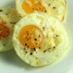 Season eggs with salt and pepper and top each egg with 1 tablespoon shredded parmesan cheese. Bake for 7-12 minutes, depending on how hard or soft you prefer your eggs.