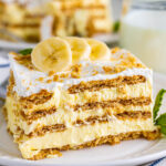 Top with some of the crushed leftover graham crackers and fresh banana slices if desired, slice and serve.