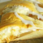 Dollop and spread the cream cheese mixture over the apple pie filling and begin folding the outer ends of the dough over the filling. Pinch dough together to seal.