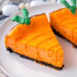 Place the cheesecake slices on parchment paper and drizzle the orange over the cheesecake in a zig zag motion. (Optional, sprinkle with sprinkles instantly after drizzling the orange melts)