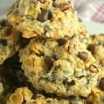 Fold in chocolate chips, cornflakes, coconut flakes, and pecans and use a cookie scoop to scoop dough onto the prepared baking sheet.