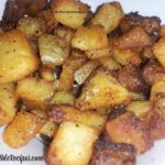 Cut the potatoes in 1 inch cubes and place in a bowl with the olive oil, pepper, garlic powder & onion powder then toss until the potatoes are well coated.