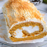 Cool for 5 minutes before inverting it onto a kitchen towel dusted with confectioner’s sugar. Peel back the parchment paper, then roll the cake up tightly. Allow to cool completely on a wire rack.