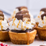 Top each cheesecake with about one tablespoon of ganache. Top with whipped cream and a mini-Twix.