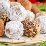 Use a melon baller or a small cookie scoop to scoop out 1 Tbsp. sized balls, until all of the mixture has been used. Roll each dough ball in between your hands to make them smooth. Place each topping you have for rolling in separate bowls, then roll the balls though the cocoa, powdered sugar or pecans to finish. Ready to serve and eat immediately.